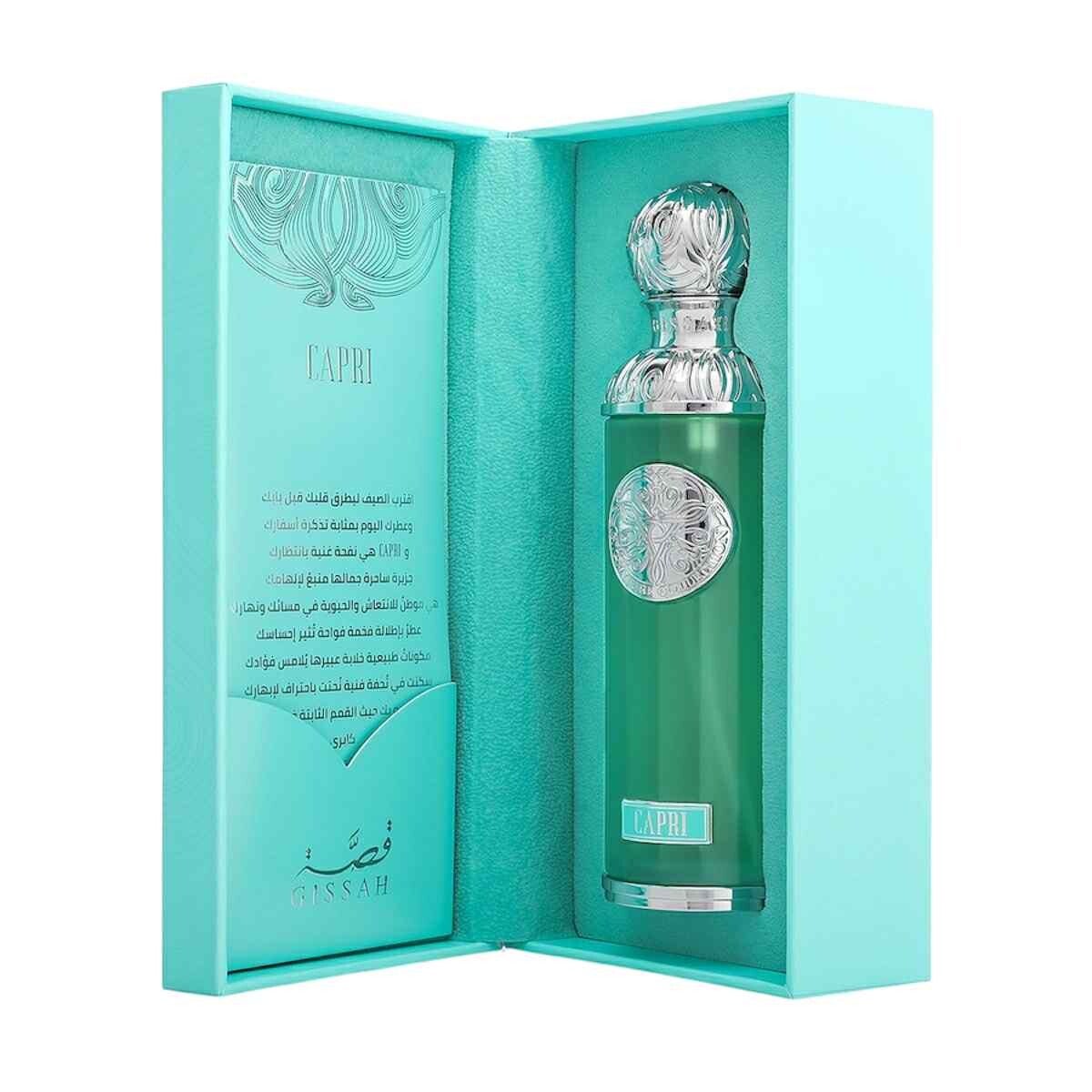 Gissah Capri is a unisex Eau de Parfum described as a refreshing and sophisticated scent that evokes coastal luxury. It has a citrus top with Sorrento lemon, marine notes, and blue ginger, a heart of Indian sandalwood, apple, and patchouli, and a base of Somali incense, dry amber, and Haitian vetiver. This combination creates an invigorating, woody, and mysterious aroma with a long-lasting and refined finish.